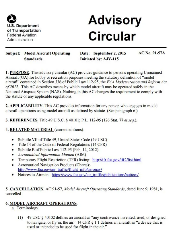 Advisory Circular 91-57A Model Aircraft Operating Standards.
